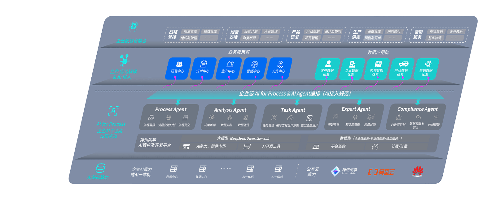 端到端的一站式AI工作空间深度融合了从企业战略规划到日常经营的全流程业务板块,,,定向解决车企内部领域多、、、、部门多、、链条长、、、场景碎片化等难题,,支持车企快速构建以AI为核心的生产力写作体系,,实现任务执行与AI能力的无缝集成与交互
