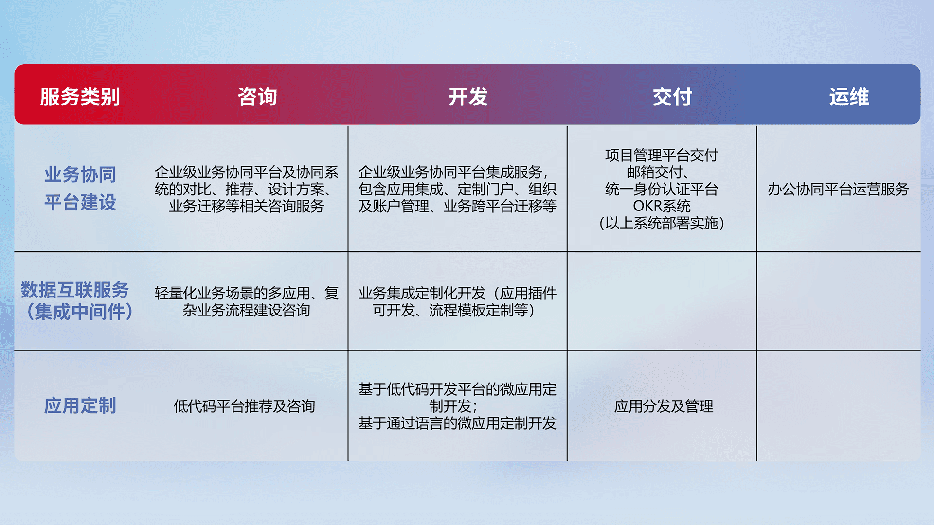 针对钉钉、、企微、、IDaas等平台级产品提供产品的规划、、、方案、、、交付、、定制化开发等服务,,,实现如统一协同办公、、、、智能客户服务、、混合会议管理、、智能数据查询、、、等业务场景,,,实现数字化转型。。