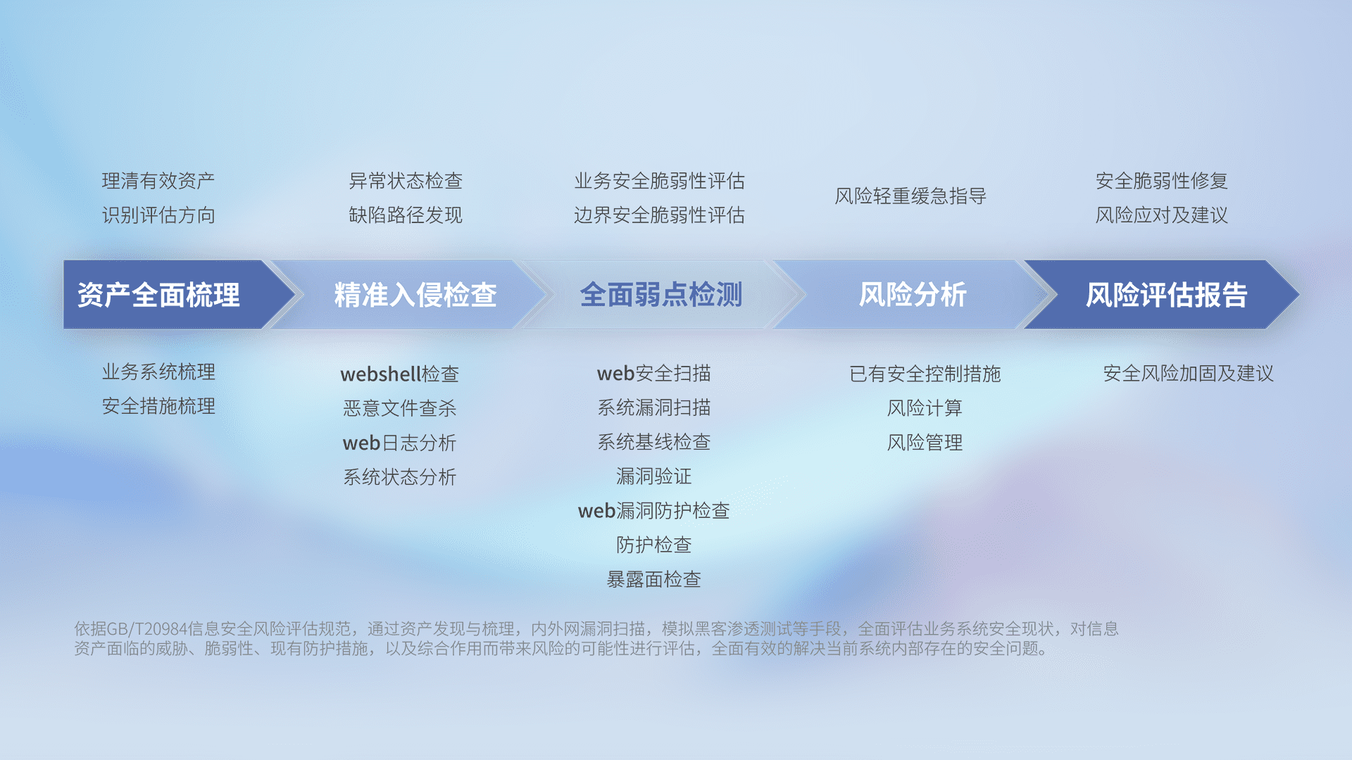 针对客户行业特性,,,以专业的安全服务+多厂商联合解决方案提供专属的一站式安全管理服务,,,,帮助客户全面感知网络空间威胁,,,基于识别、、检测、、分析、、、防护、、、、监测、、响应的服务理论模型,,,从方案咨询、、、集成交付、、评估验证、、、、优化加固、、运维运营,,,致力于为客户提供完整的闭环管理式安全服务。。。。以实战经验为客户打造高抵御风险的安全体系,,,,帮助客户发现威胁、、、、对抗威胁、、、、处置威胁,,,不断积累安全对抗能力,,持续保障数字化安全。。。。